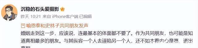 怎么看,老叔这段婚姻都还挺幸福的,怎么他就要转移财产离婚了呢? 很快,反转就来了,11日,一位名叫“沉稳的石头爱摄影”的网友,自称是老叔和史林子的共同朋友,他爆料两人的离婚原因,是史林子多次出轨被抓包。 他还晒出了一些证明女方出轨的聊天记录。